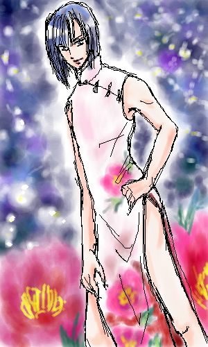これも「papillon」のチャイナドレスのアキラ 下着は・・・はいていませんよね?(にっこり) この話はオフ本に収録出来なかった・・・残念★ |