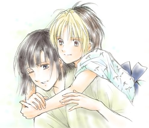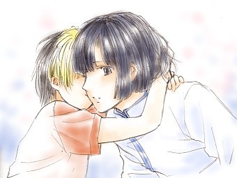 アキラの息子、真尋とヒカル。 本当の親子のように仲のいい二人の一コマ。 これがのえたさんにいただいた 最初のイラストだったと記憶しています。 このイラストにも、短い文章を添えさせていただきました。 何度見ても、飽きない・・・ |