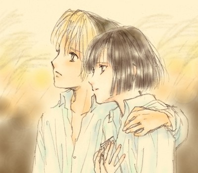 | 拙作「RAINY]に寄せて描いてくださいました。 同じページに置くのが申し訳ないほど この一枚で十分物語を感じさせてくれますよねー。 アキラの美しさは言わずもがな ヒカルの切ない目元にも、引き寄せられてしまいます・・・ |